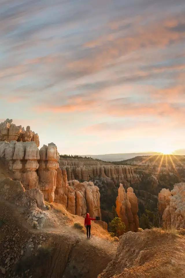 在晨光初照,山花烂漫之际登上山顶,看看是否伸手就能触摸到天边的云。