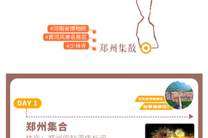 全国各地的小伙伴们到达郑州集合。到的早的亲们可以到【河南省博物院】去看看人类文明的起源发展,也可以到【黄河风景名胜区】去,感受母亲河的大河文化,还可以到【少林寺】去,学习一招半式的少林功夫……一定记要品尝河南特色美食哦,河南烩面、道口烧鸡、胡辣汤……