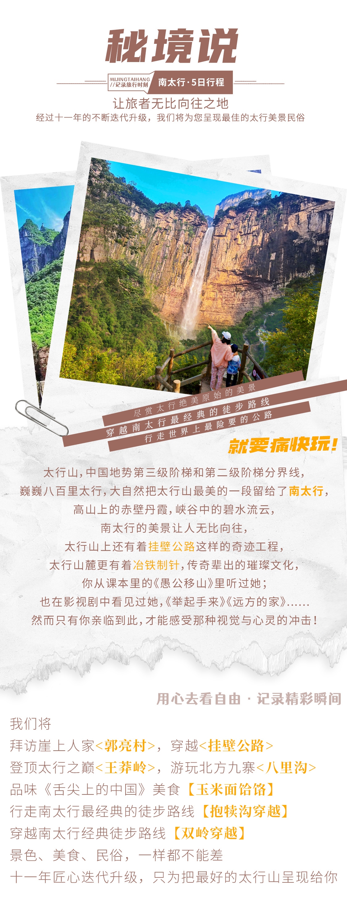 今天可以早早起床,感受一下清晨的【八里沟景区】“太行之魂、中华风骨”的魅力。也可以睡个懒觉,早餐后,大家顺沟而出。一路上,登红岩绝壁,赏峡谷云海,望流泉飞瀑,闻老子布道,更有“仙人迎客峰”欢迎您的到来!山青水秀、碧水丹崖,不愧是号称“北方小九寨”!