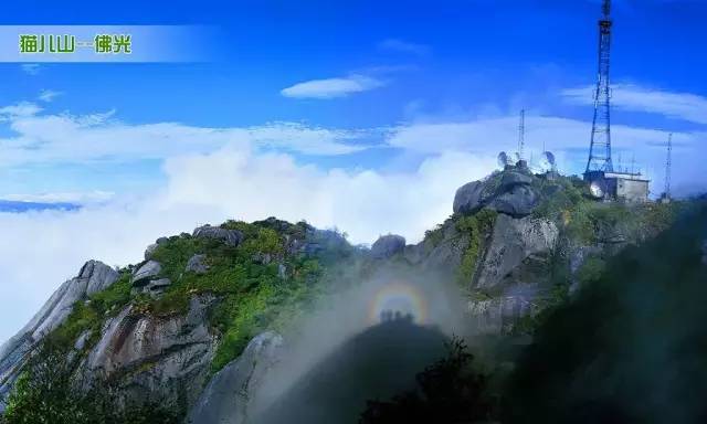 猫儿山岭谷间常常烟雾缭绕,风起云涌,气象万千。春夏多雾时节,如逢阳光斜照,在山顶很容易形成神奇的“佛光”景观,七色祥光,彩环笼罩,如梦似幻,领队带队经验给你更容易遇到佛光。