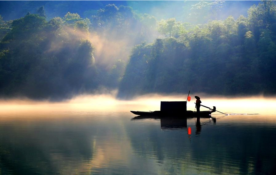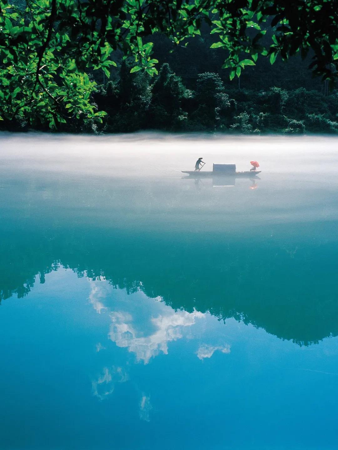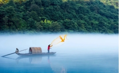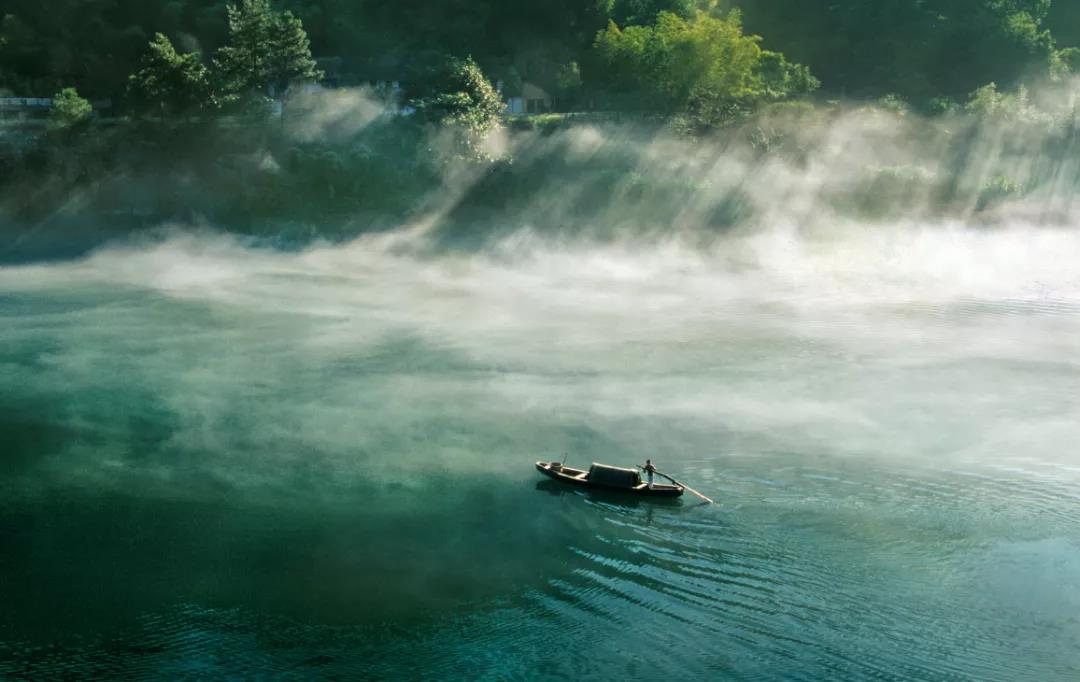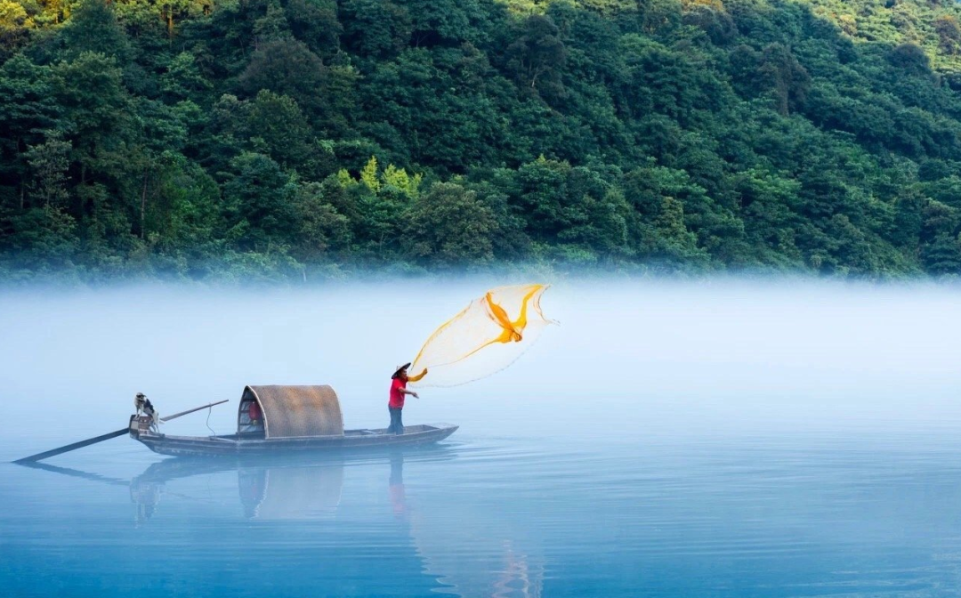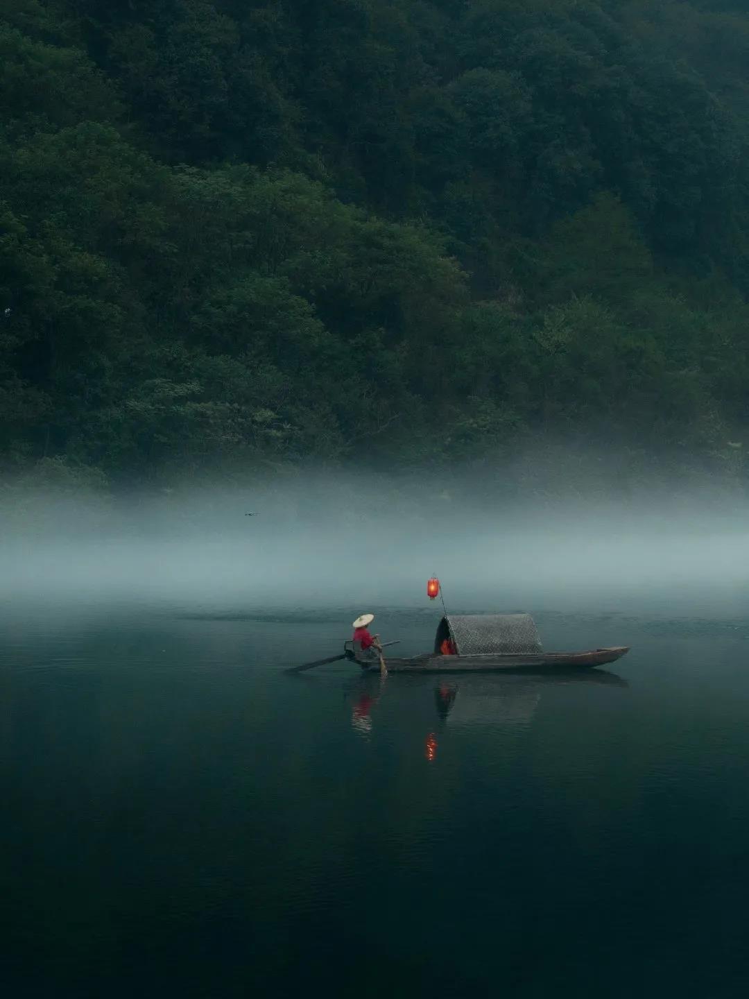 渔翁乘一叶扁舟,自雾中悠悠驶来
