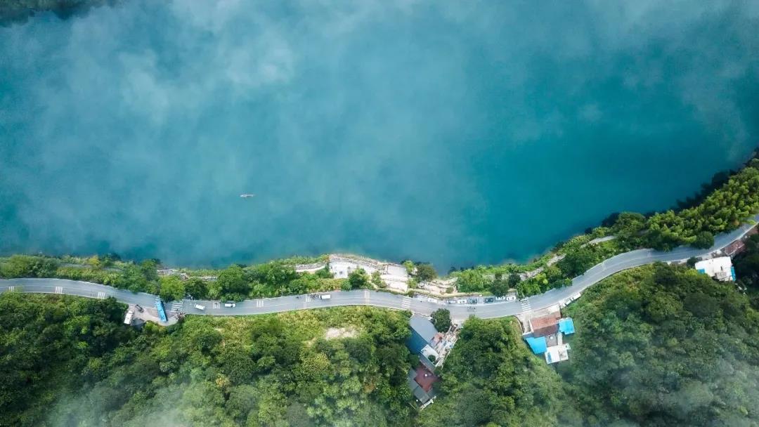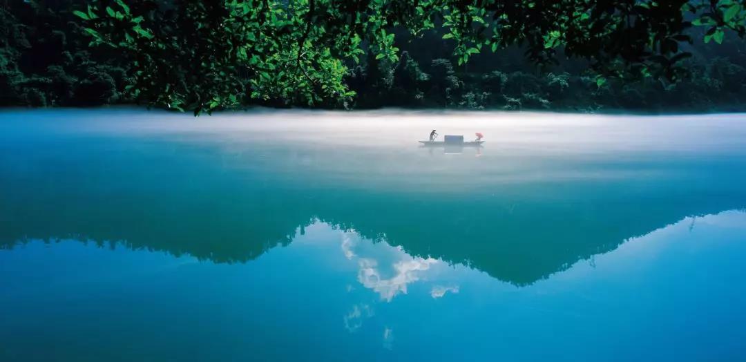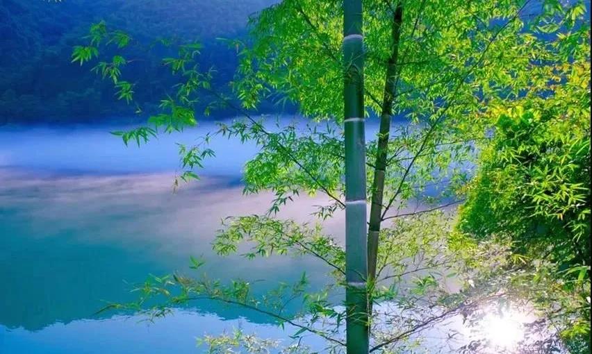 远山如黛,青山碧流,烟波浩渺,碧波如镜