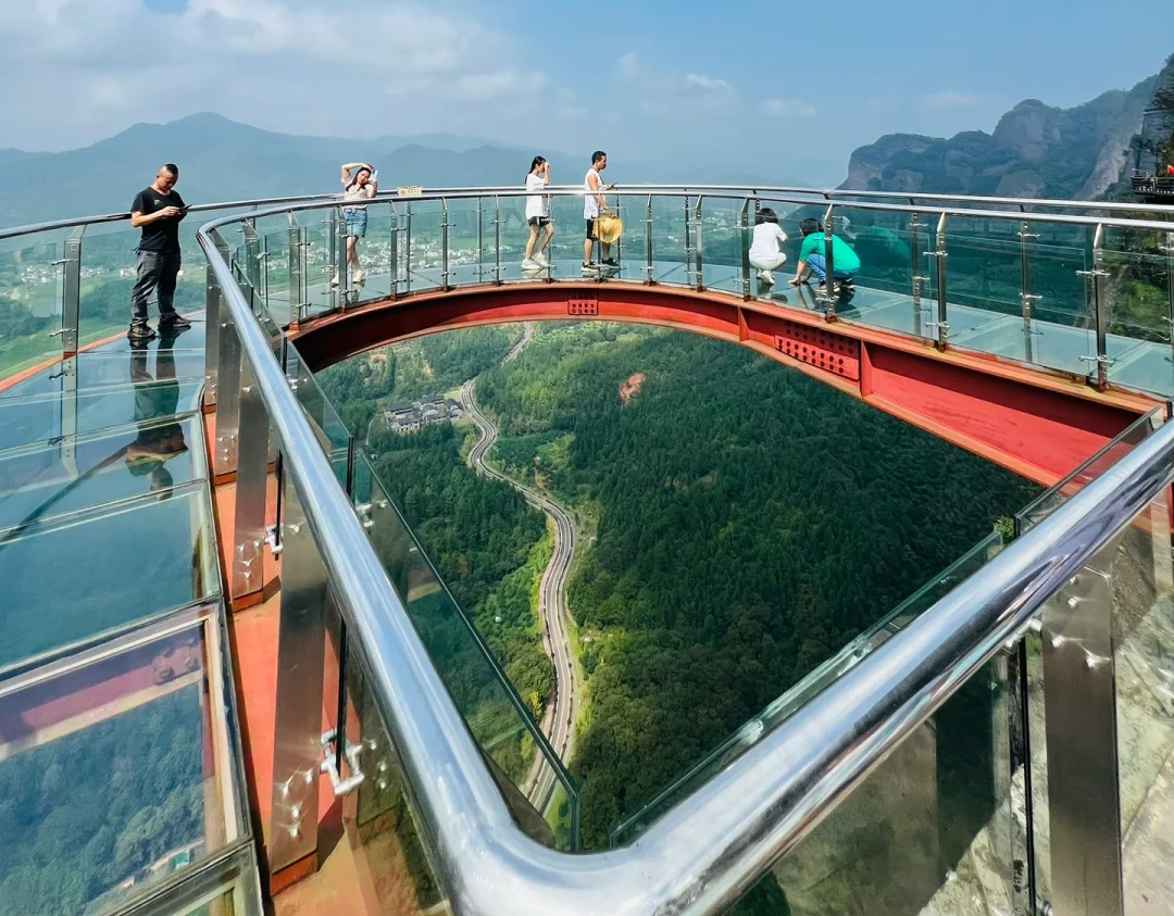 南武当玻璃栈道全长219多米悬挂在海拔600多米的岩石上,沿峭壁而建站在栈道往远方看去,栈道与山脉环抱