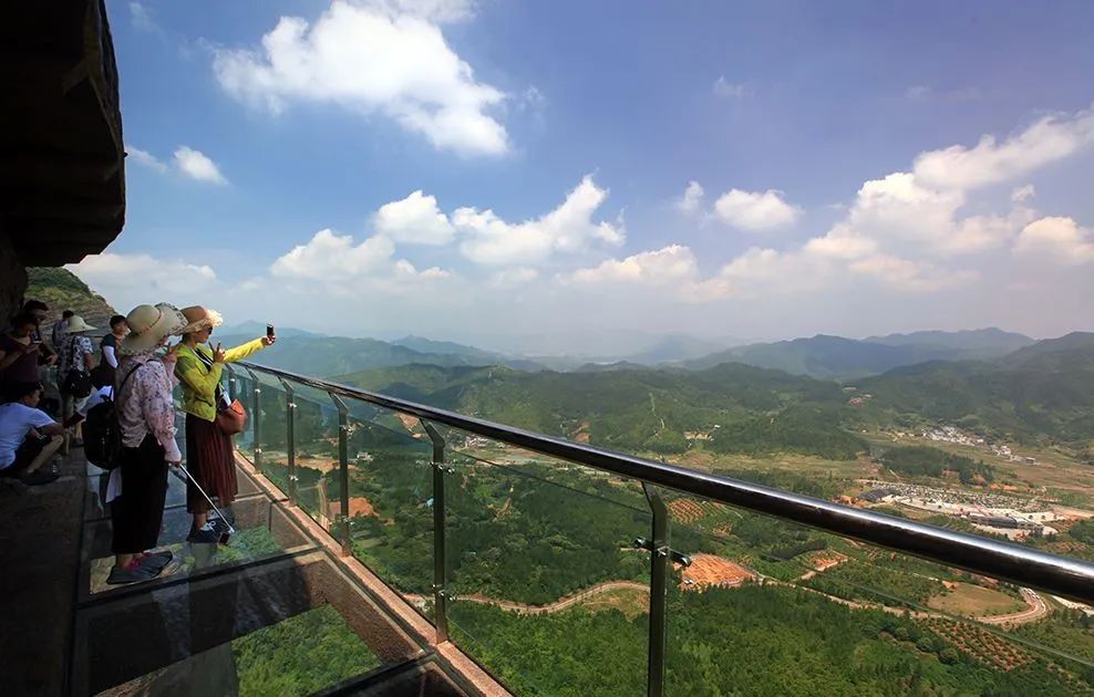 站在玻璃眺台上,放眼望去,一览众山小之感油然而生,山下的田园风光、传统村落,错落有致的万亩桃林风光尽收眼底,仿佛来到了陶渊明笔下的“桃花源”,如仙如醉。