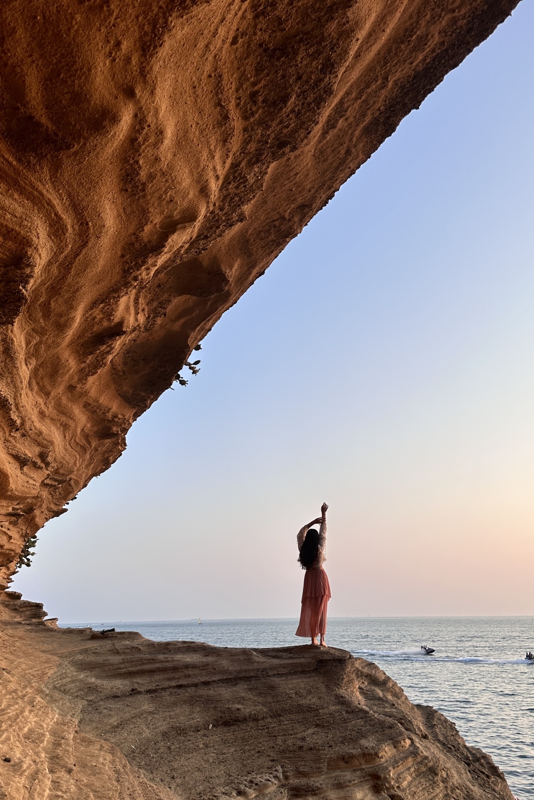 和心爱的人坐在海蚀洞内的珊瑚石上