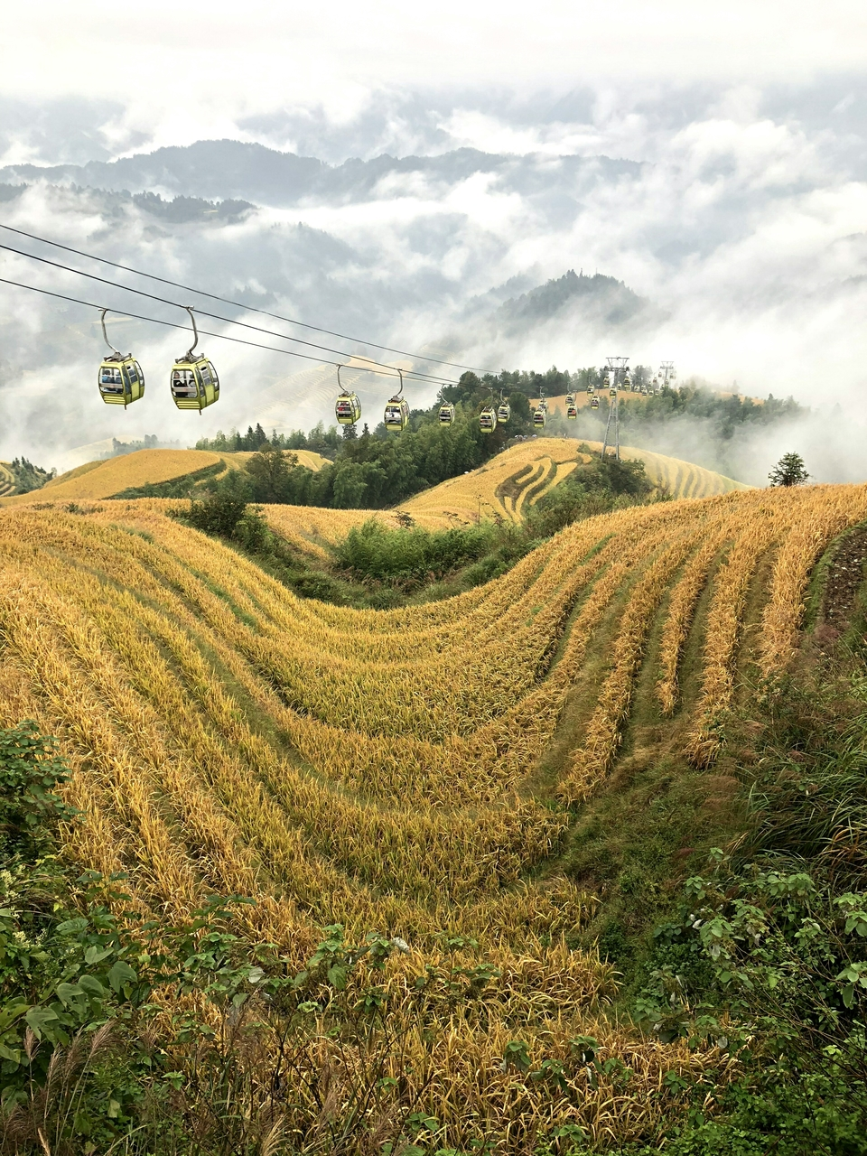 金佛顶是一定要去的,整片梯田的制高点,油画般的风景尽收眼底,也是唯一有缆车不需要步行的观景台,整个索道被刷成了和梯田一样的黄绿色,与山区融为一体。