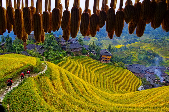 9月底正是龙脊准备秋收的季节,稻田里一片片金黄,与5月放水时相比,别有一番视觉效果。
