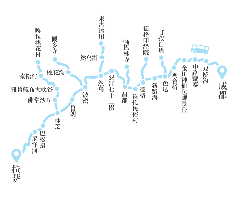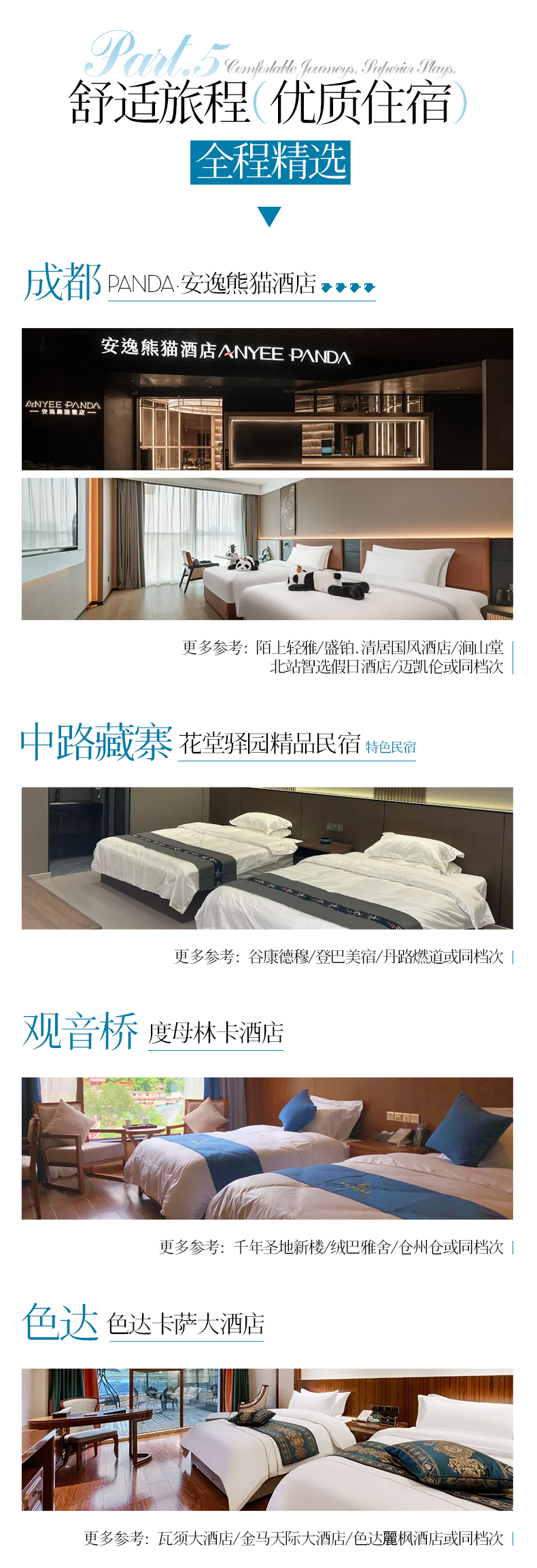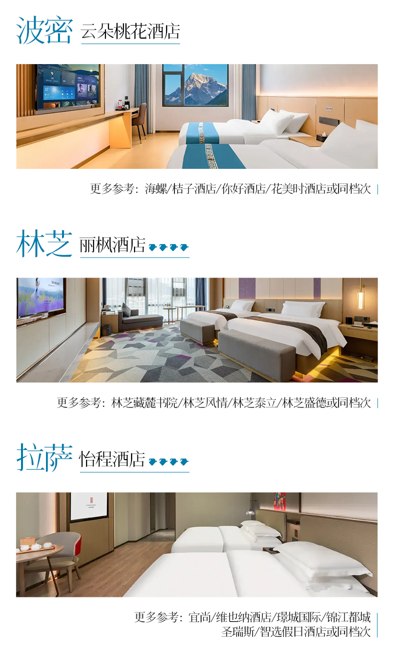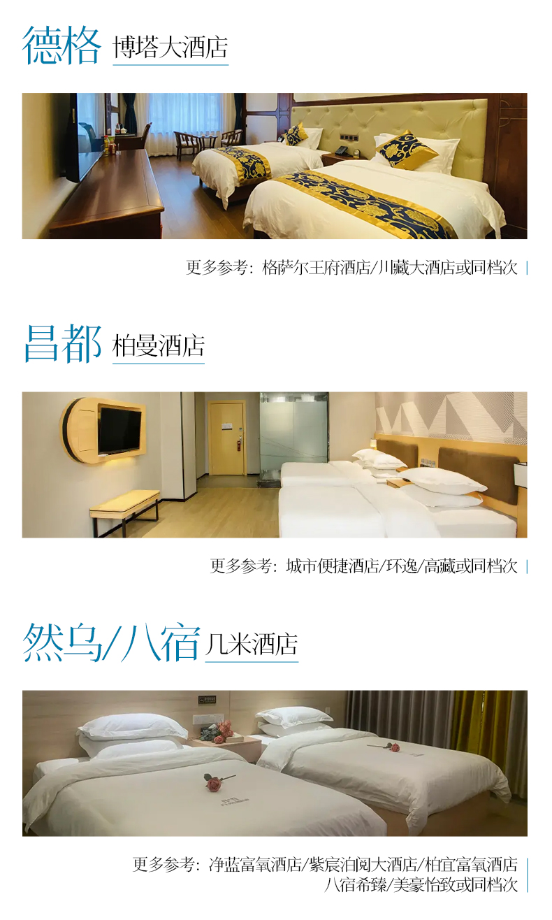 3、门票及观光车:双桥沟观光车70元/人,新路海门票100元/人、观光车50元/人,色达观光车48元/人,德格印经院门票50元/人、来古冰川门票150元/人、观光车60元/人,嘎拉村门票30元/人,索松村门票90元/人,佛掌沙丘门票30元/人,雅鲁藏布大峡谷观光车90元/人。
