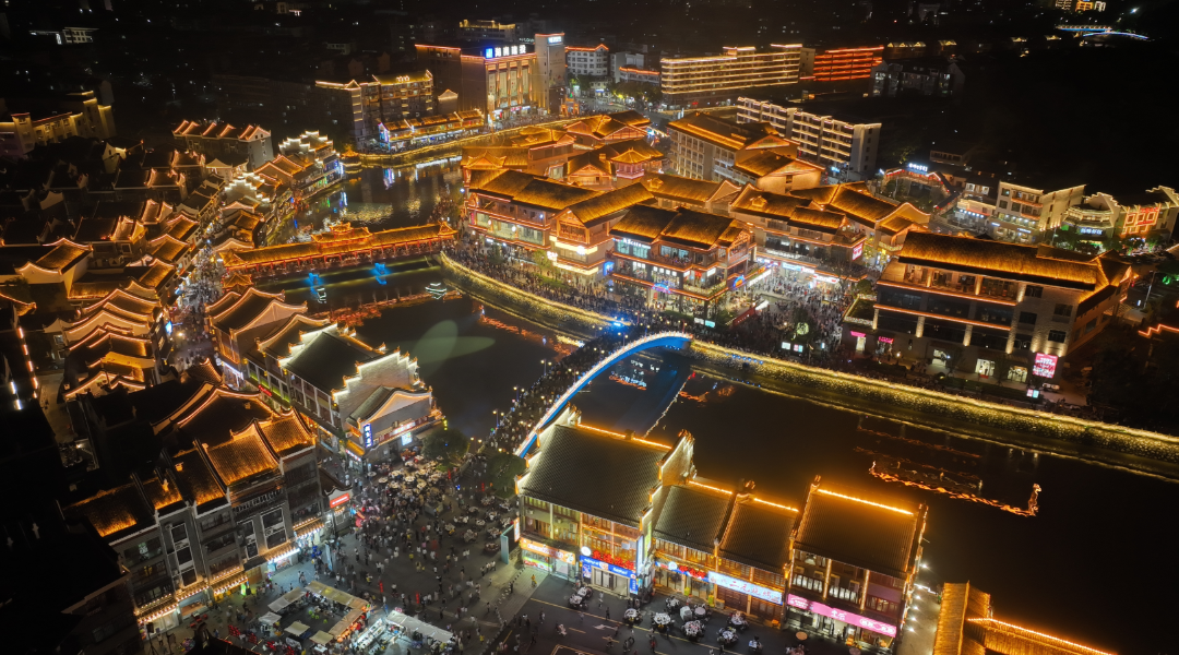 华灯初上,一江两岸的璀璨灯火映照在古桥流水