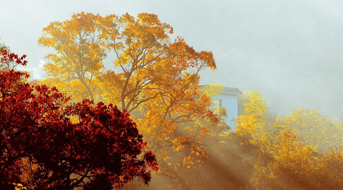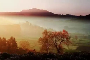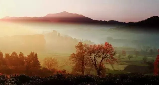 清晨雾气或炊烟中的火红枫树简直就美得不像人间植物了。