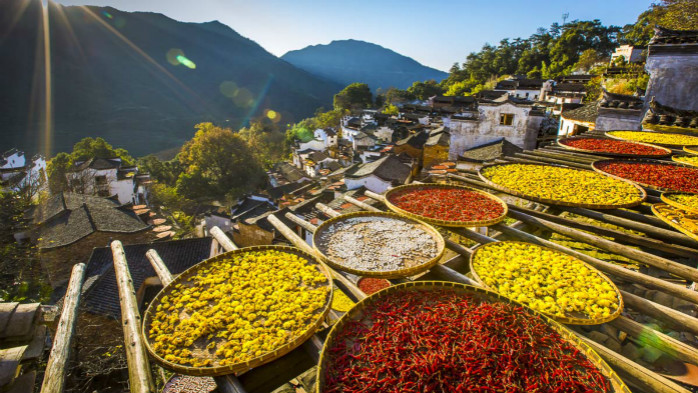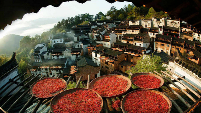 挂在山崖上的篁岭古村,“地无三尺平”,数百栋徽派民居在百米落差的坡面错落排布,每当日出山头,晨曦日照,整个山间房屋晒架上五彩缤纷的丰收果实,绘就出少见的“晒秋”农俗景观。春晒茶叶、夏晒山蕨、秋晒果蔬、冬晒乡俗……一年四季延绵有续。