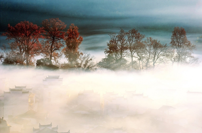 06:30 为日出+晨雾时间,选好最佳拍摄位置,等待日出,在金色的阳光照耀下,白墙黑瓦,早晨的炊烟,高大的红枫,形成一幅美丽无比的国画,沉醉其中,不能自已...