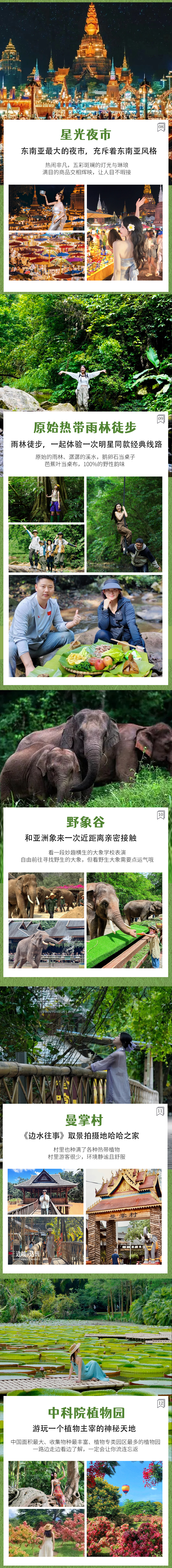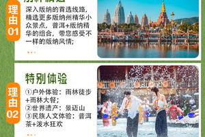 【特别体验】:1)户外体验:特别安排体验热带雨林轻徒步+尊享户外雨林大餐,零距离感受热带雨林的独特魅力;2)世界遗产:深入世界非物质文化遗产腹地-景迈山,了解和体验不同人文和风景;3)民族人文体验:体验民族普洱茶文化和傣族同胞泼水狂欢;