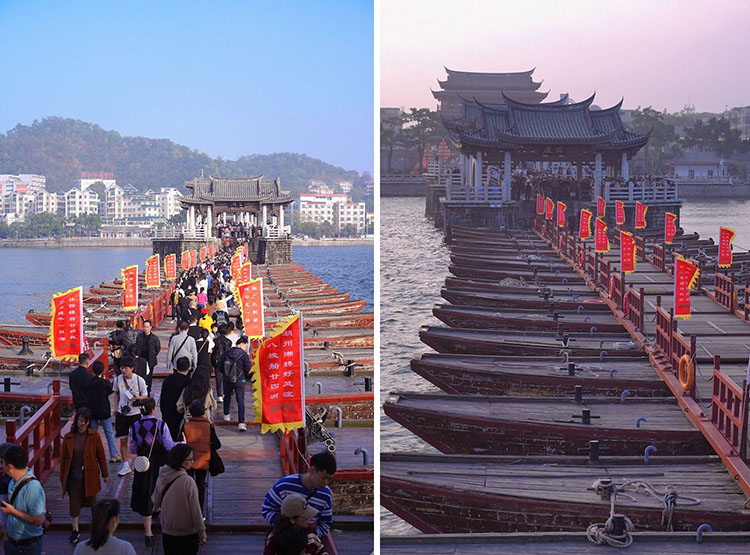 每天10点左右,广济桥会上演一幕“拼船搭桥”,而到下午5点的时候,又会上演一幕“过河拆桥”。