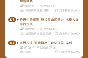 3、门票:四姑娘山双桥沟门票80元/人+观光车70元/人、木雅大寺男众区门票16元/人、海螺沟门票90元/人+观光车70元/人