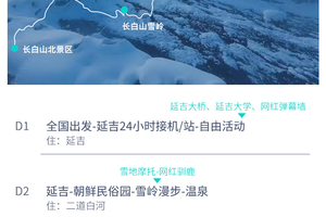 延吉-朝鲜民俗园-雪岭漫步(117KM,车程约2.5小时)-雪地摩托-网红驯鹿-二道白河(62KM,车程约1.5小时)