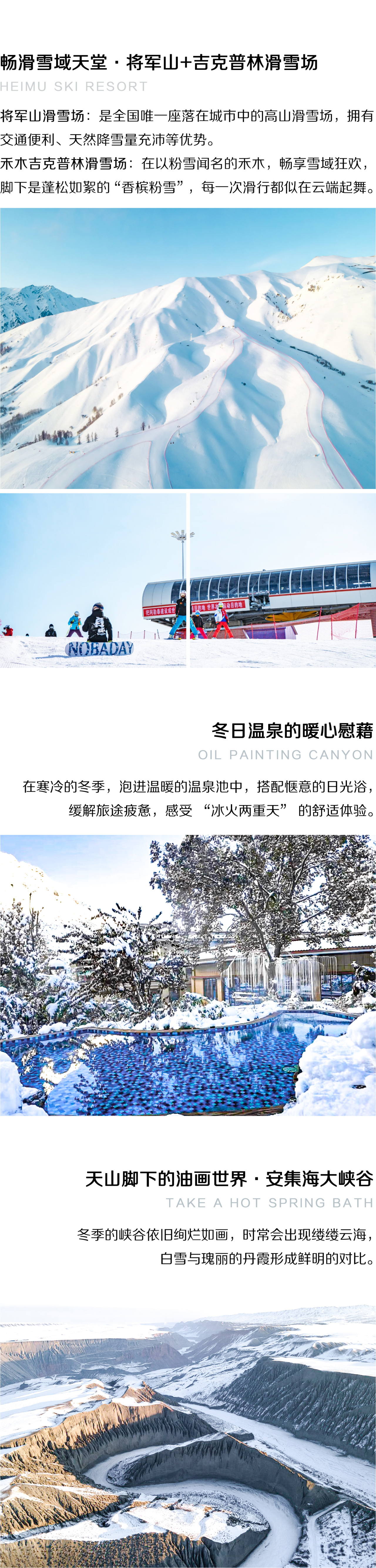 2.如遇大雪封路,前往安集海大峡谷的道路无法通行,替代景点为独山子大峡谷(门票自理)。