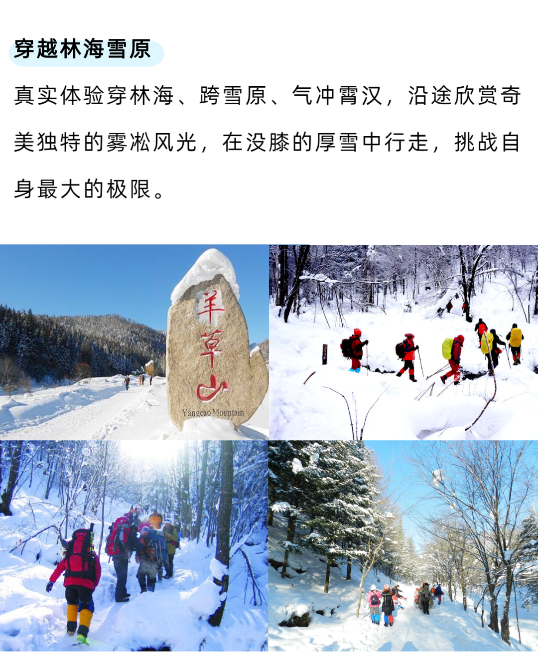 12:30-14:00 继续徒步,【羊草山顶-中国雪乡】我们穿梭在茫茫雪原中,欣赏着玉树琼花般的雪松,感叹着大自然的神奇魅力!