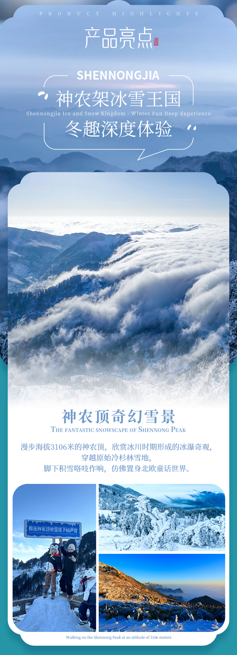 踏上神农顶,仿佛踏入了一个童话般的冰雪世界。寒风呼啸而过,带着丝丝清冷,却也让人更加真切地感受到大自然的力量。站在高处,俯瞰着被白雪覆盖的山谷和森林,云海在脚下翻腾涌动,如梦如幻。