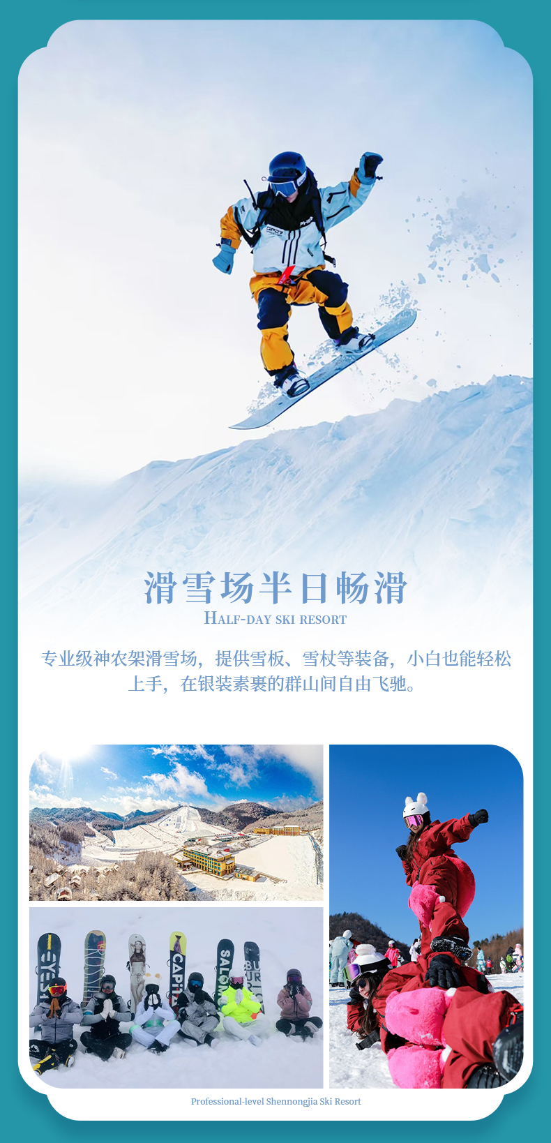 接下来,出发前往神农架滑雪场,车程约1小时到达滑雪场,换上装备开始滑雪啦!剩下的时间都在雪场,大家就尽情的撒欢吧!