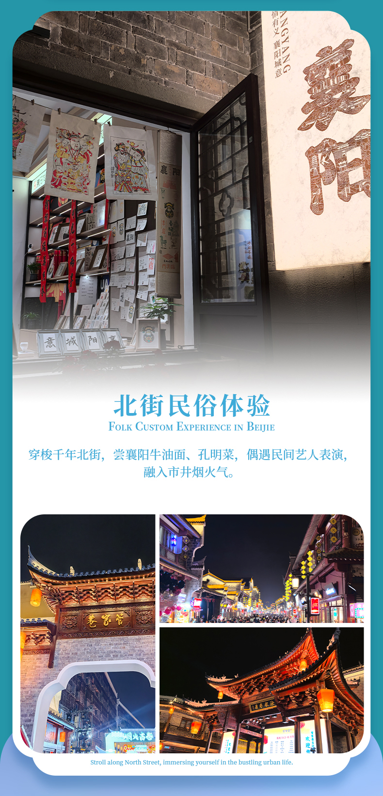 城内的街道灯火辉煌,热闹非凡。古色古香的店铺林立,琳琅满目的商品让人目不暇接。特色小吃的香气弥漫在空气中,勾引着人们的味蕾。在这里,你可以品尝到襄阳的传统美食,感受这座古城的独特风味。