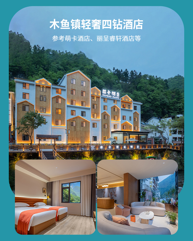 住:木鱼镇准四酒店,参考萌卡酒店、喜雅酒店、丽呈睿轩酒店等;