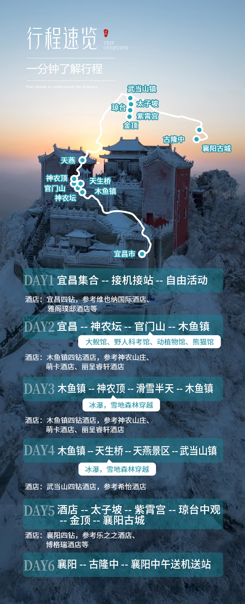 1.门票:神农架景区套票、神农顶景交、武当山门票+景交车+保险、武当山紫霄宫门票、武当山金顶门票、古隆中门票+景交;