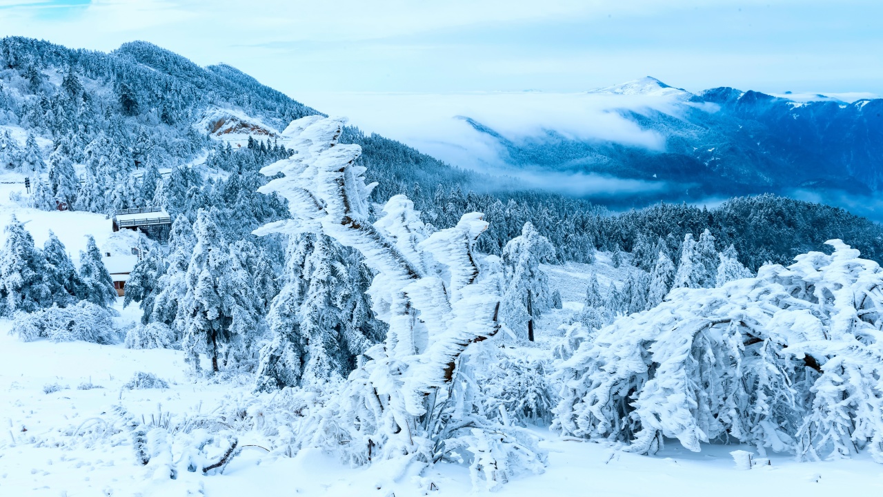当雪花纷纷扬扬地飘落,神农顶被装扮成了一个银装素裹的世界。连绵的山峦被白雪覆盖,如同一条洁白的巨龙蜿蜒盘旋。古老的冷杉林在冰雪的包裹下,愈发挺拔苍劲,枝头挂满了晶莹剔透的冰挂,仿佛是大自然雕琢的艺术品。