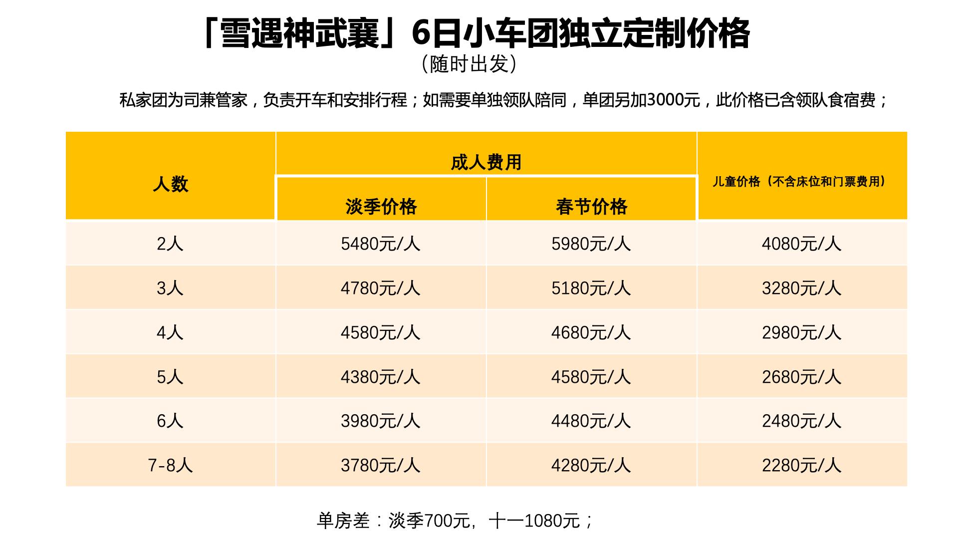 2.单人房差费用:住宿费用是按照2人入住1个标准间安排,若有单人报名,不愿拼房的情况,将会产生单人房差情况。