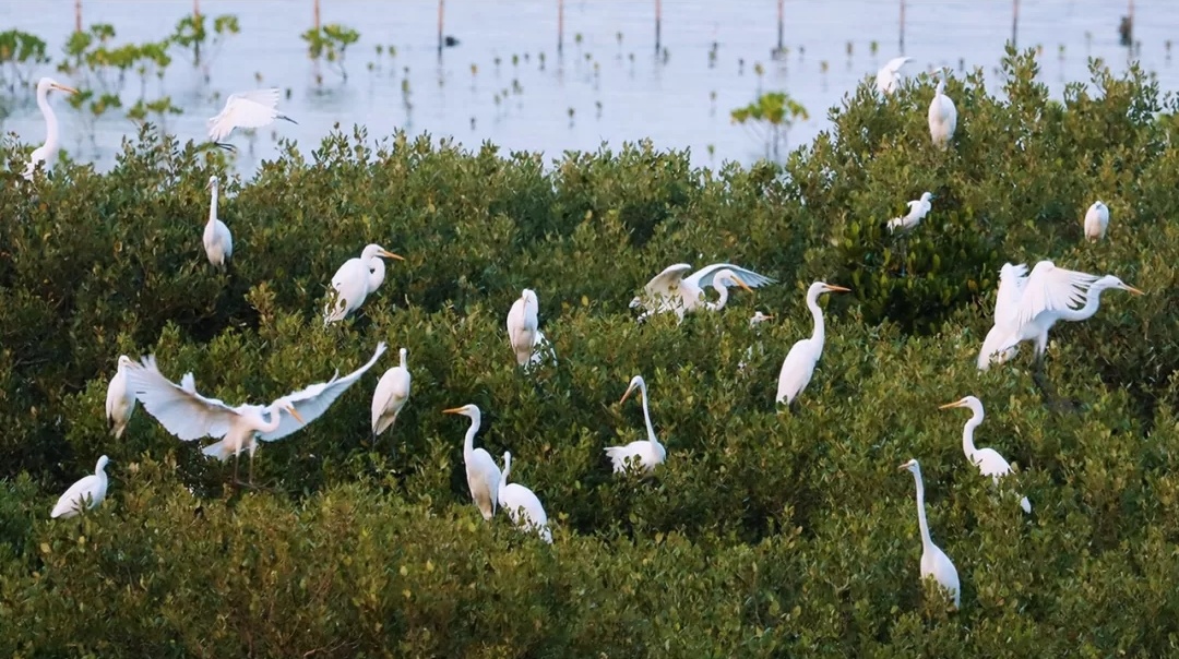 红树林成百上千的白鹭鸟在红树林里面徘徊打转,也有“安分”的白鹭鸟在枝头上栖息,随手一拍都是“落下与孤鹜齐飞,秋水共长天一色”的视觉美感