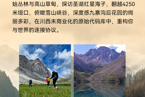行程概览:我们在【黄龙九寨高铁站】出站口集合,时间为11:30-12:00,领队会提前到达集合地点等待大家。然后我们乘车前往【阿翁沟】到达徒步起点,徒步前往红星海子,一路都是陡峭的山峰,稀松的森林。中途会经过一处非常平整的山坳,山坳是一处干枯的湖泊,现在里面长满了草,非常茂盛,雨季时也会有积水会偶尔渗出来,海子名叫“草海子”。再往上走,到达【红星海垭口】的下边,翻越红星海垭口较困难,坡度约45度,垂直高度400米,翻山垭口后往前,行走越200米,就看见了【红星海】。红星海海拔3900米,四周山石堆积,山峰耸峙,湖面宽大平静,湖水湛蓝,站在这红星海前,给人一种震撼的感觉。红星海位于“阿翁沟”的最尾端,在红星岩的脚下,故名“红星海”。游览完以后返回到营地,今天比较轻松,往返路段6KM。