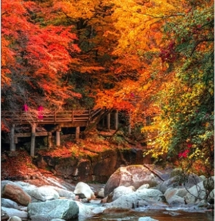 早餐后,我们从汉中出发,沿着蜿蜒的盘山公路深入【米仓山腹地】,抵达被誉为"红叶水韵童话世界"的【十八月潭】(行程距离:130km行车时间:2.5小时)。这条3.2公里长的秘境,由18个翡翠般的潭池串联而成,十月底的红叶如火如荼,金黄的银杏、橙红的枫树与碧绿的潭水交相辉映,落叶随溪流旋转起舞,木栈道上每一步都沙沙作响。乘车至光雾山密林深处,到达素有“月潭赛九寨,红叶天下绝”之美誉的【十八月潭】,长约3.5公里的珍珠沟内密布着18处形似月牙的瀑潭,溪水从布满红叶的山间流过,红叶随溪水漂流不时打着回旋,与漫山彩林勾勒出如画般醉人秋景。思月潭、净月潭、仙女潭、孔雀潭......眼里是盛不完的景,镜头有捉不住的秋。要说ZUI具特色的一潭,莫过于这高约50米的【婚纱瀑布】,远远望去仿佛洁白头纱,纯净无暇。大家可以利用慢门捕捉到这一绝美风光。