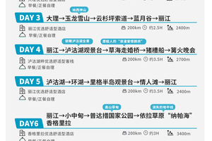 因旅游车受相关部门规定,同时为游客的安全考虑,晚上非特殊情况下不能运营,以上行程涉及古城游玩的时间,如在古城没有玩尽兴的伙伴,晚上敬请各位游客朋友游玩结束后自行打车返回酒店,敬请理解和支持。