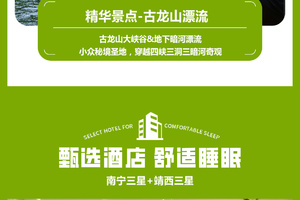 2.住宿:南宁、靖西两晚酒店住宿费,单人报名组织方优先安排同性拼房(标间或三人间),如遇到无同性法拼房需要补房差200元,国庆房差400(以报名时客服相互沟通确认为准!)