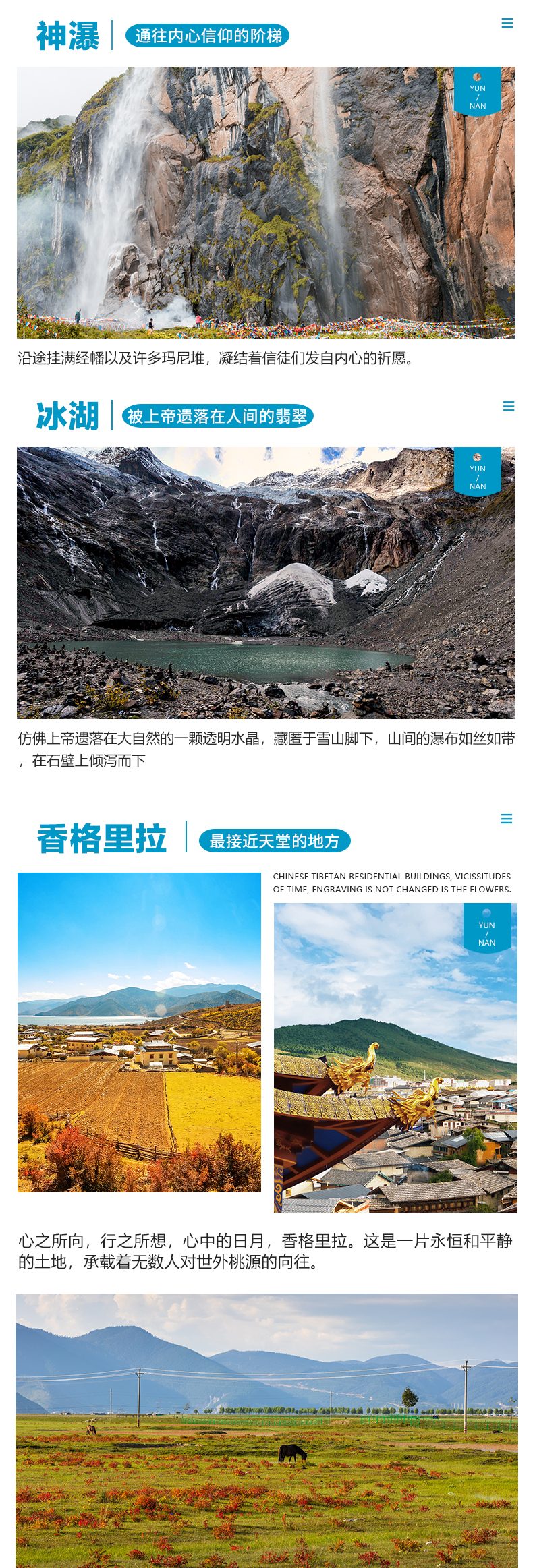 这里可以观看神女峰和五冠峰的全貌,更重要的是这里是朝圣者接受洗礼的地方,只有接受过神水的洗礼,整个朝圣之旅才算是完整,身体和心灵都得到净化,而后我们将原路返回雨崩村客栈休息。