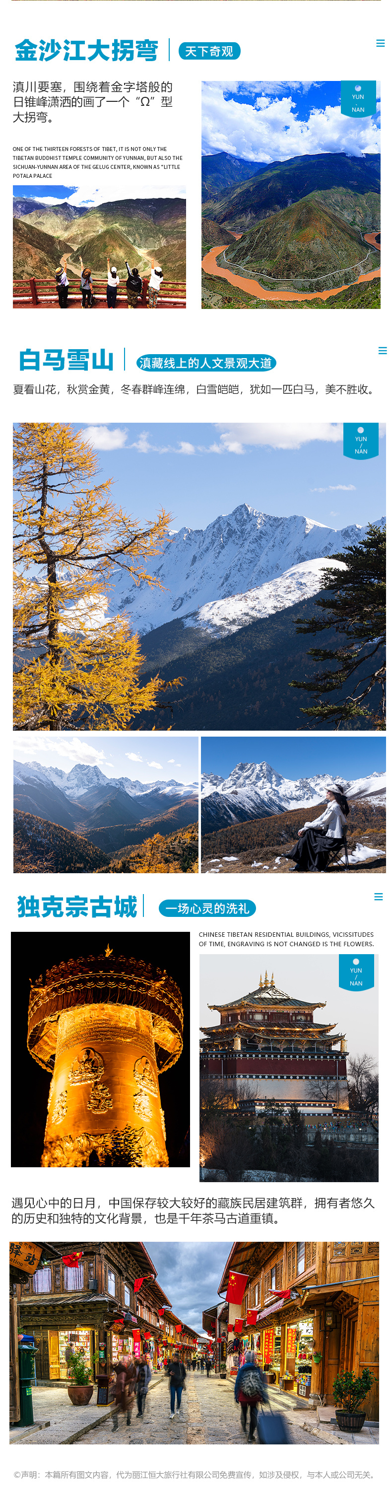 丽江→独克宗古城→依拉草原→奔子栏→金沙江月亮湾→白马雪山→飞来寺