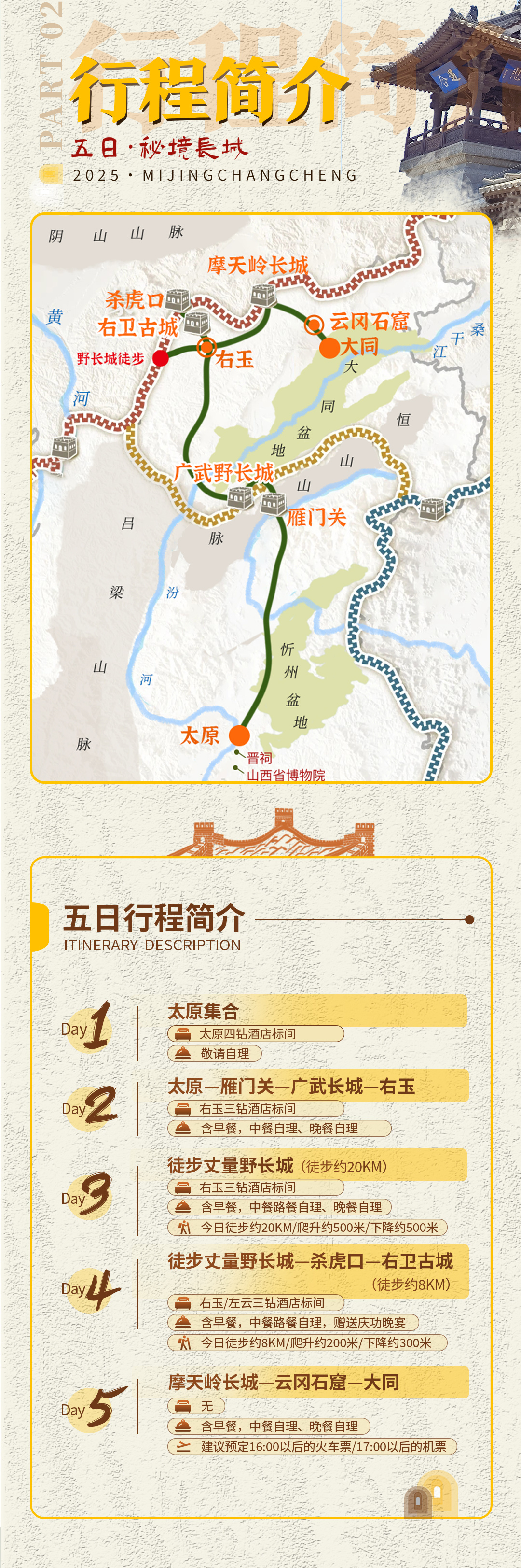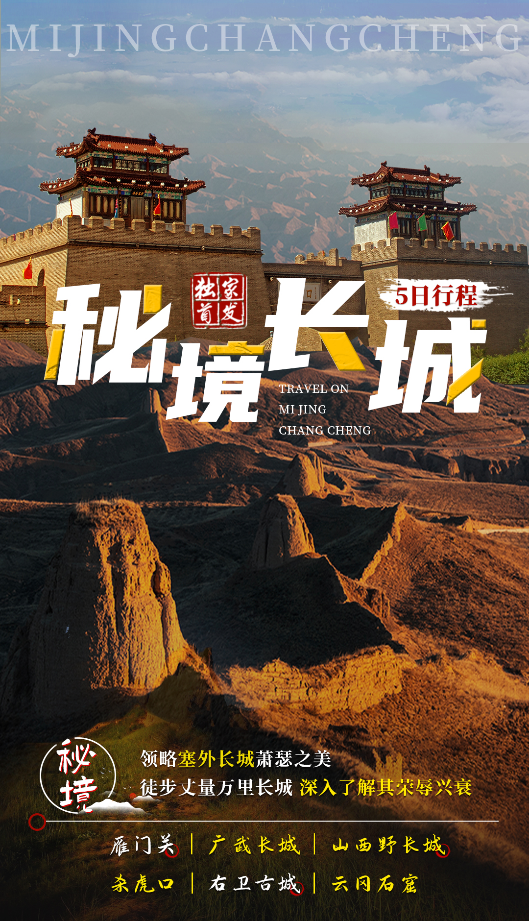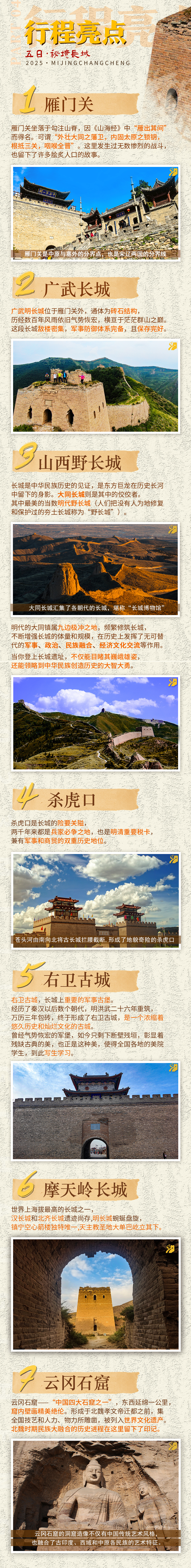 早餐后,前往被誉为“中华第一关”的【雁门关】,雁门关素有“天下九塞,雁门为首”之说,可见其卓越的战略地位。也因此,雁门关自古便是兵家必争之地。数不尽的无名将士将热血抛撒在这片土地上,一代良将李牧、卫青、霍去病、薛仁贵、杨业等都在曾在这里留下足迹。杨家将镇守雁门,忠君报国的故事,更也是广为流传。