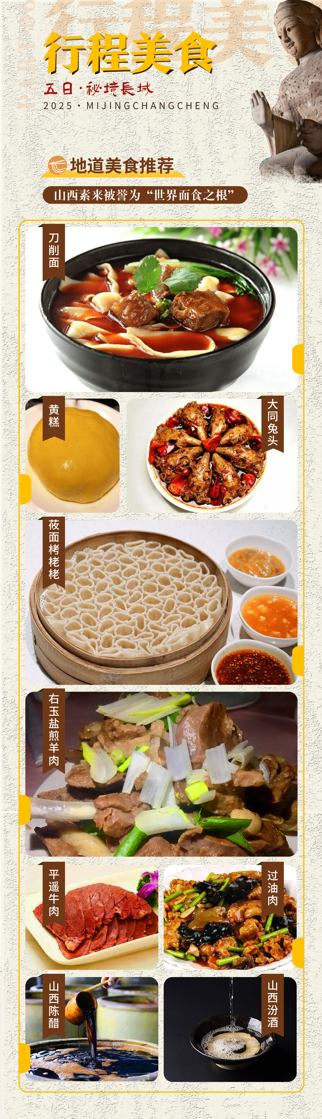 之后乘车前往“中国九大古都之一”的大同。大同在历史上一直是北方中国的中心城市,素有“三代京华,两朝重镇”之称。时间充裕的小伙伴们,可以在【大同古城】闲庭信步,尝尝小吃,品味积淀了上千年的文化底蕴和皇城气象。
