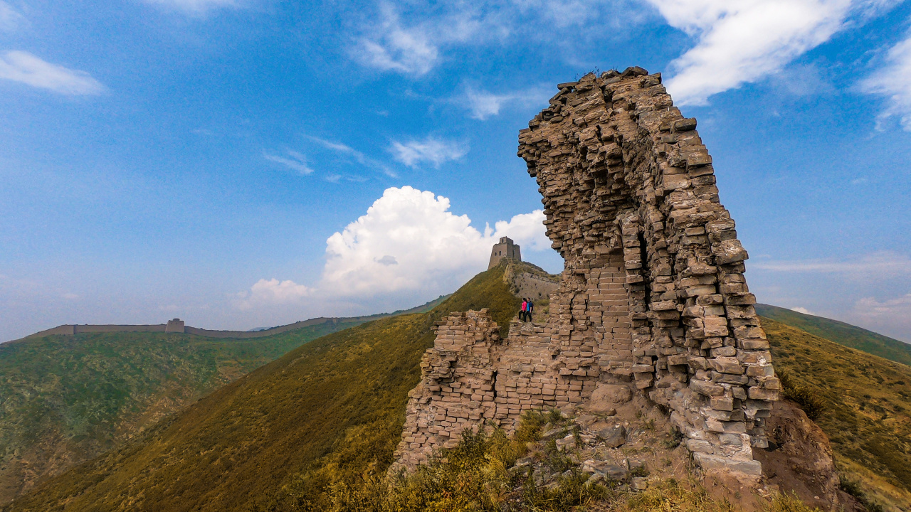 一路上,辽阔的土地,低矮的天空,残破的边墙,牧羊种地的老人,组成了一副萧瑟却又生机勃勃的画面,然人感慨沧海桑田。我们走在长城之巅,宽不足一米的墙顶小道上,两边是断壁沟壑,耳畔是西风呼啸,感觉整个人也如风中的枯草一样,在不停地摇摆。一个人之于长城,之于历史长河,是多么的渺小,是多么的微不足道。
