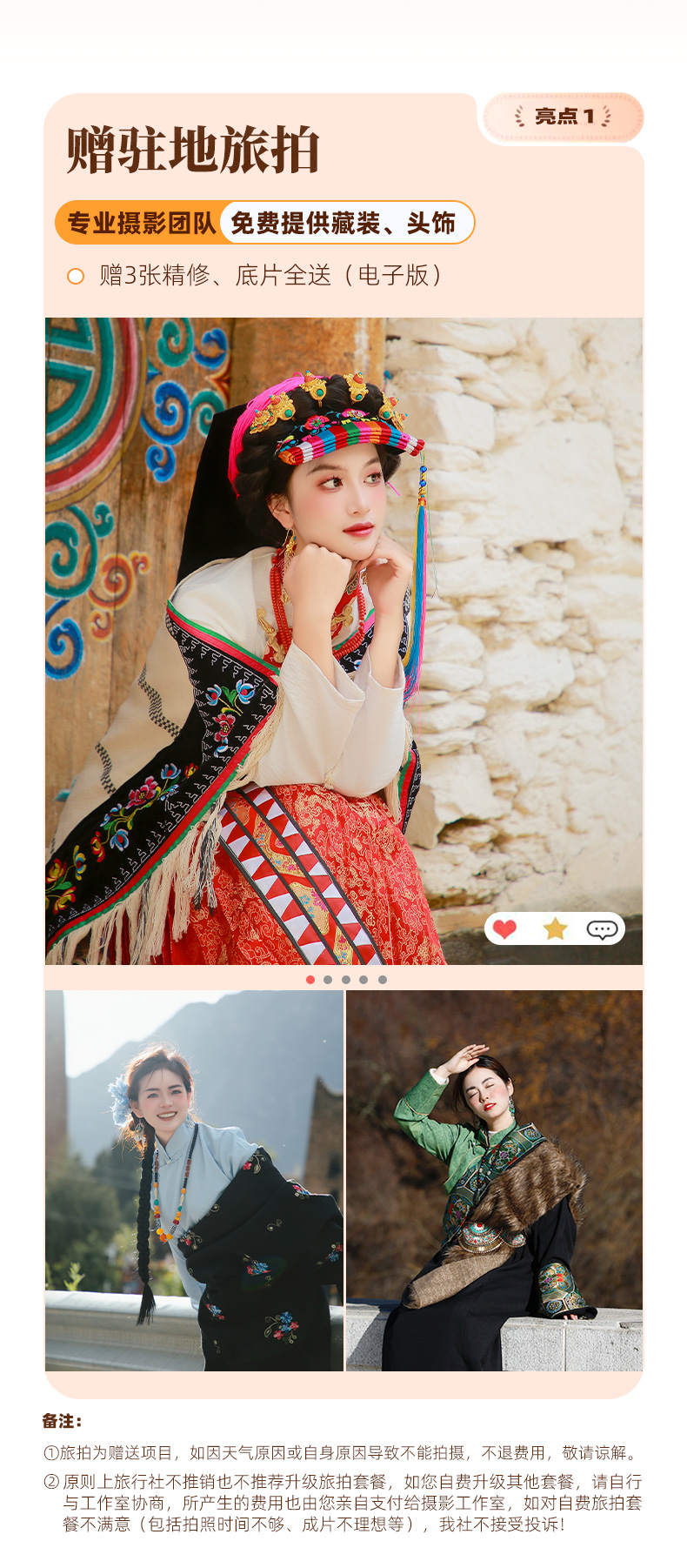 1、驻地藏式旅拍1次(免费提供藏装/首饰,赠3张电子版简修,底片全送);