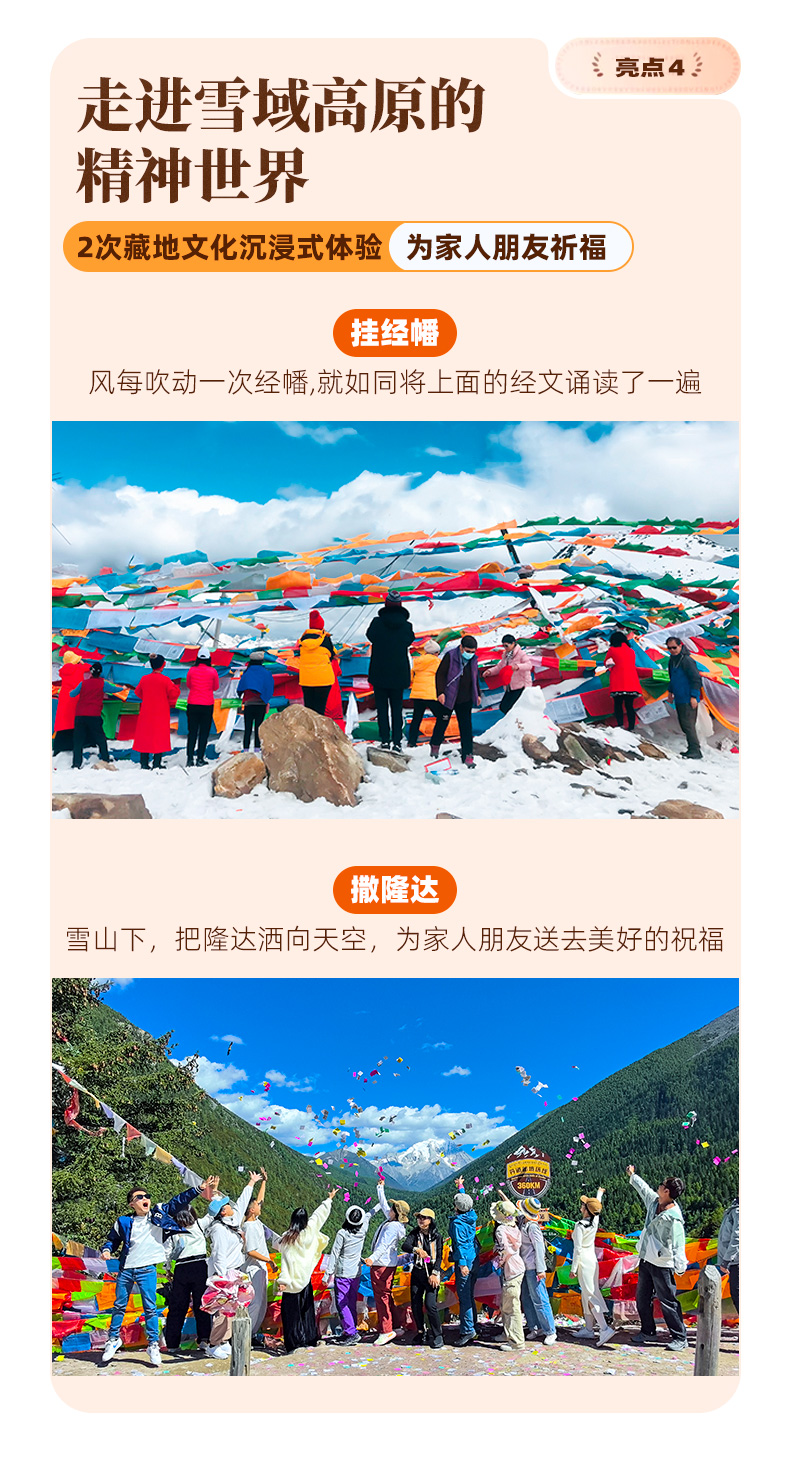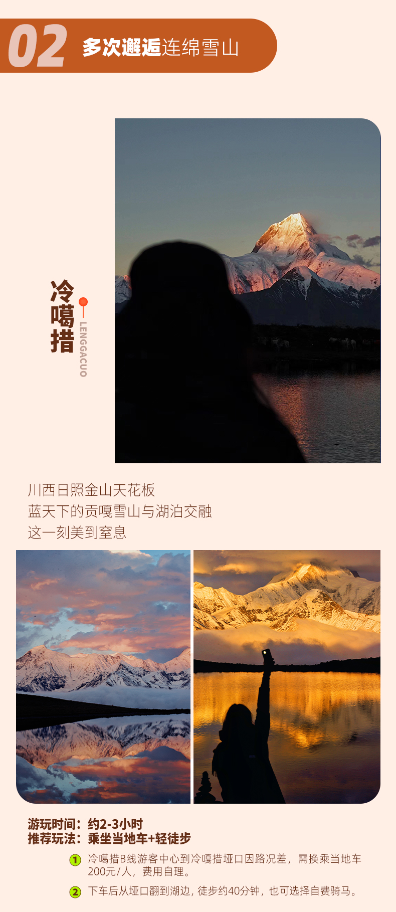 4、景交:四姑娘山双桥沟观光车70元/人(必须),亚拉雪山观光车90元/人(必须),墨石公园观光车20元/人(必须),冷噶措清洁费30元/人(必须)、冷噶措B线游客中心需换乘当地车往返200元/人(必须);