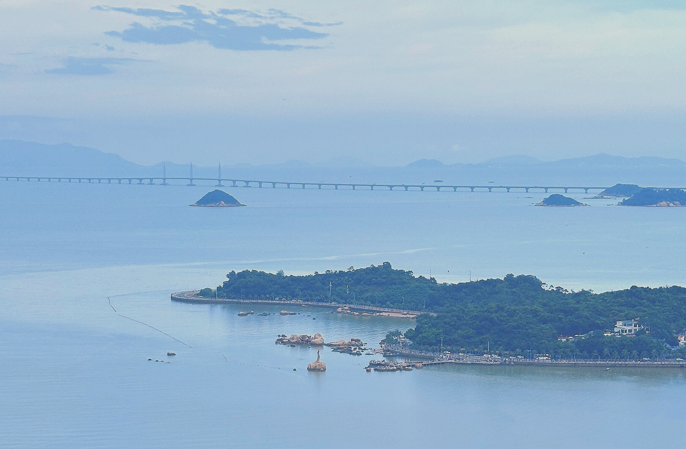 可鸟瞰月贝、珠港澳大桥、海滩、