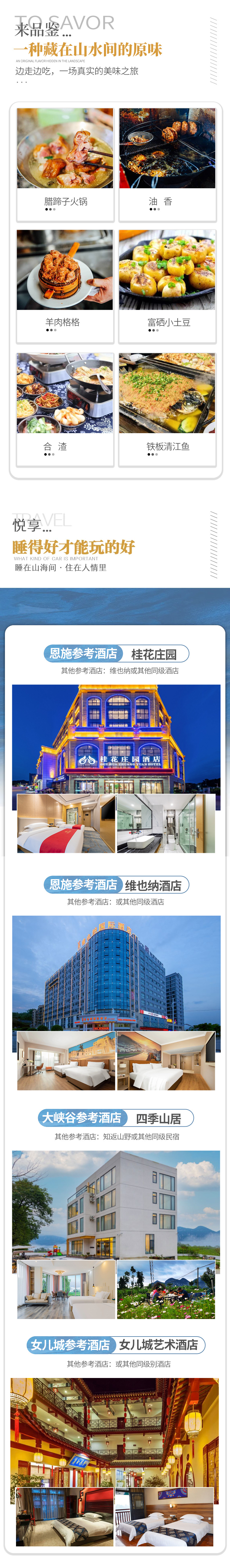 3. 住宿:共4晚(恩施高端准四酒店或同级别女儿城民宿两晚,大峡谷山景客栈一晚,宣恩精选酒店一晚)