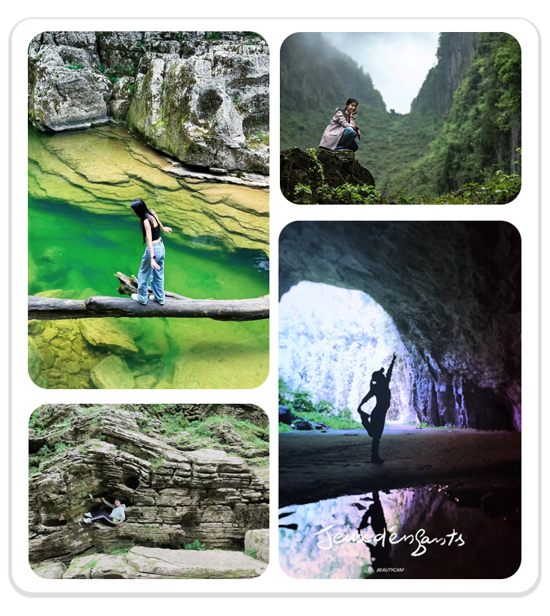今日重头戏--清江古河床,探索利川最美徒步线,一级一步循着古人的脚步,踏出的是轮回和岁月。接着便来到今天的徒步精华--古河床巨石阵,途遇独家寨,行走于巨石上,脚踩亿年前的巨石褶皱,自然的鬼斧神工。再接连穿过三洞连两天坑的奇妙地貌景观,感受河床曾经的浩荡;最后装备好我们为您提供的照明设备穿过大龙门,过一场火车过山洞的瘾~之后映入眼帘的便是电影《聂隐娘》取景点之一--峡谷草坪,林岫叠翠,草木葱笼,牛羊满地,是时候来张最美时刻了!预备好表情和大长腿,面对镜头吧。