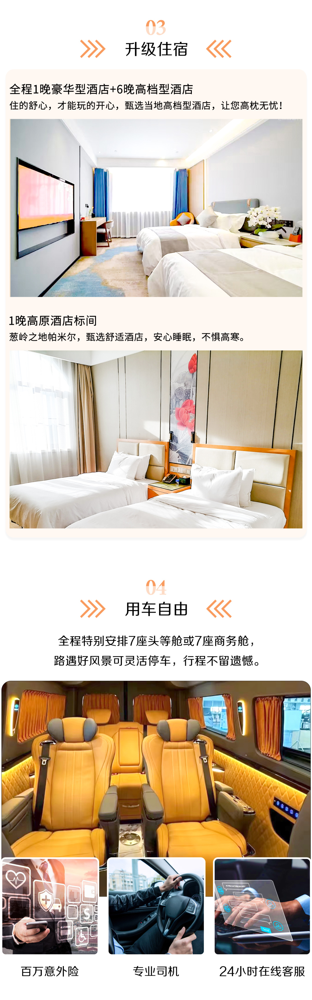 3.赠送集合日当天免费接机/接站服务(2人起赠送,提前抵达者请自行前往酒店)。请提前至少3天告知航班/车次信息,如未告知,视为自动放弃。默认安排拼车(1小时内),如您不想等待,可自行打车或搭乘地铁前往酒店(费用自理)。抵达乌鲁木齐机场/火车站后,请主动联系接机人员确认上车位置,如出现等候的情况,请给予谅解。不含送机及送站服务,送机(站)服务:5座车100元/辆、7座车200元/辆,如需要请提前至少1天告知工作人员。