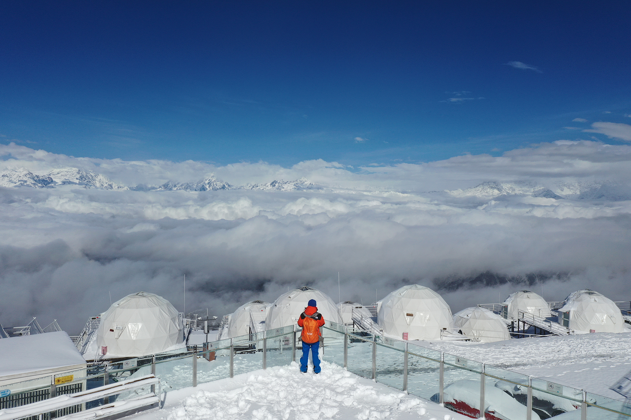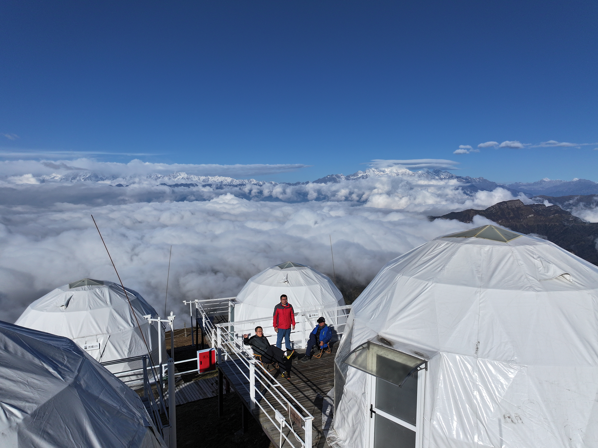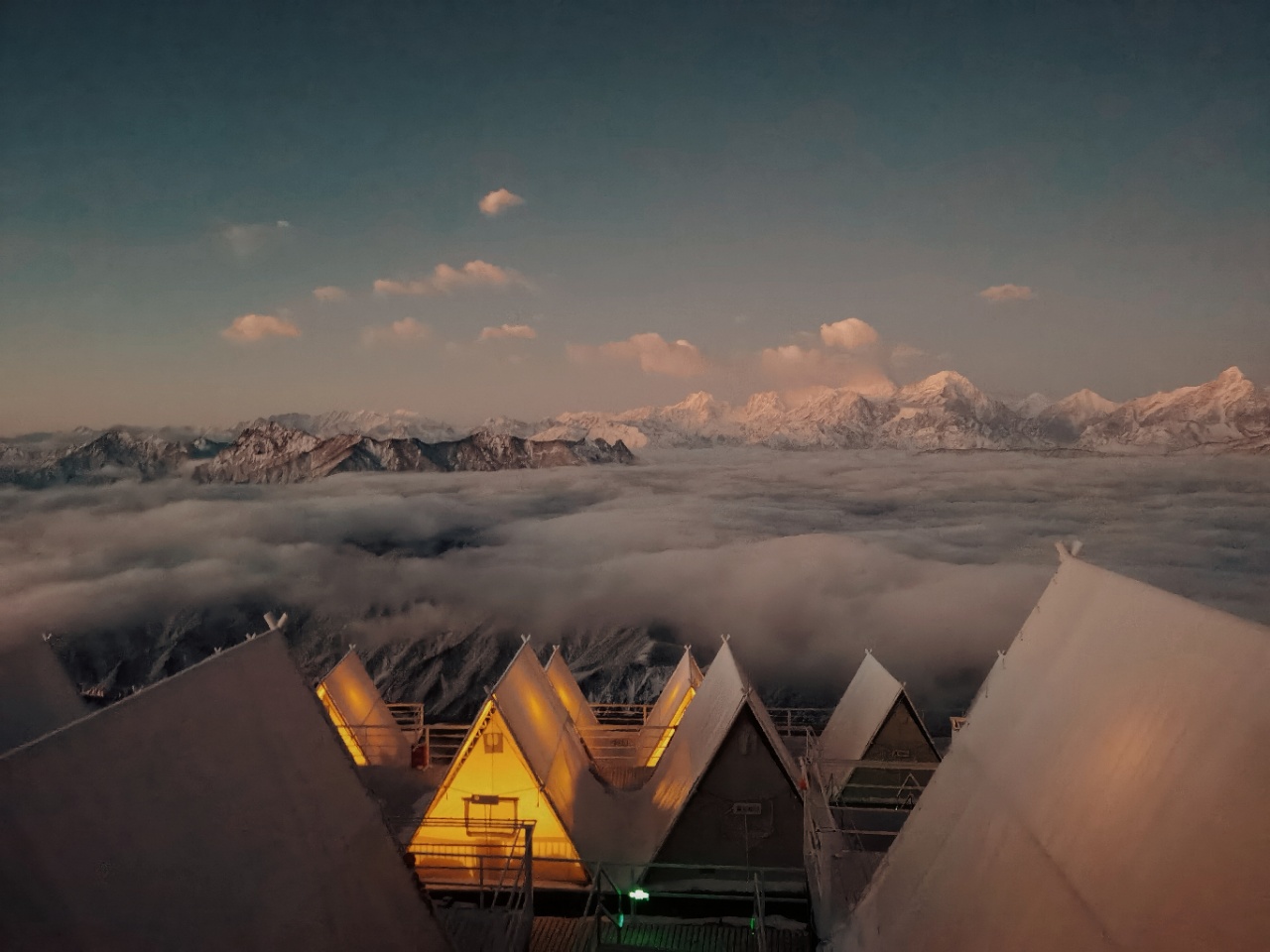 清晨,推开门帘,就能看见门外的风景,牛背山就可以观赏拍摄一场贡嘎东坡日照金山,看天空与贡嘎雪山的色彩在短短几分钟内瞬息万变。早上也是山谷间容易形成云海的时间,遇见“海上金山”的奇观。也可以一起徒步15分钟去3666观景平台,在这里你能享受360°的观景体验,牛背山的云海浓密而均匀,仿佛大河涛涛,从天而降,在山脚下突遇断层,如同瀑布般倾泻而下。