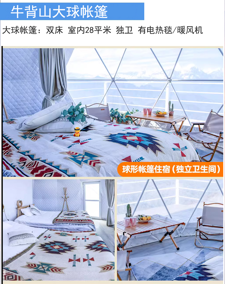 2、住宿:包含行程所列标准入住(2晚酒店+1晚藏家客栈、1晚牛背山圆顶大帐篷、一晚四姑娘山镇客栈);