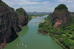 从象鼻山出来后乘坐景区观光车前往:龙虎山竹筏码头,开始体验惊险刺激的竹筏观光之旅。山麓沿泸溪河乘竹筏西行,七里之内有一百多座山峰,其中最著名的就是被称为“仙水岩”的24座山峰。这里的清溪绕山蜿蜒、奇峰横卧碧波,四野景色美不胜收,有“小漓江”之称。两岸的岩石千奇百怪、气象万千。从上清码头可以乘到竹筏,一路上不仅可以看到“十不得”景点。