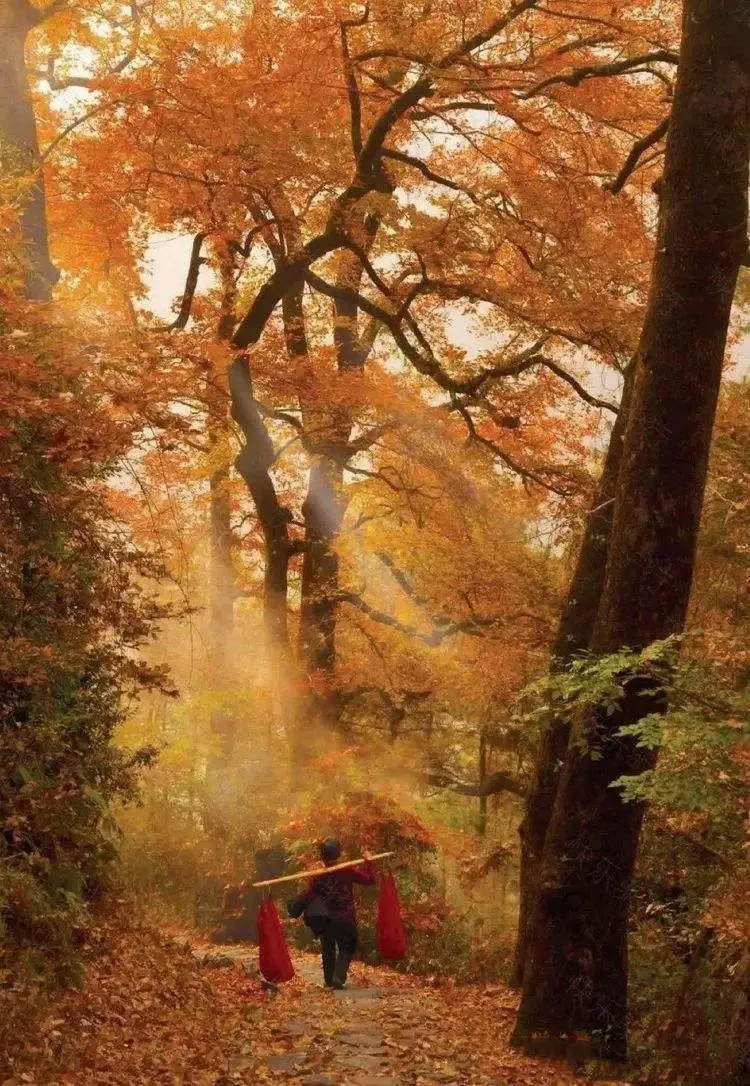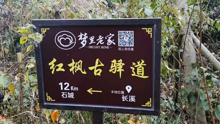 我们开始徙这条还末开发的古道,一路古树参天,枫红毯铺路,鸟儿欢唱,30年前,村里人种田,挑谷的古驿道。路程大约12公里,徒步4~5小时左右。