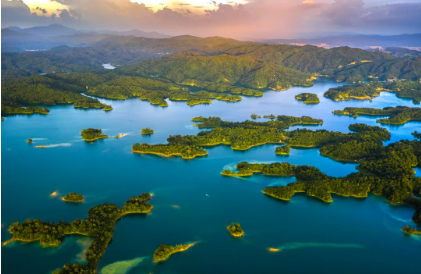 三百八十多个岛屿如翡翠散落湖中,近处的苍翠欲滴,渐远的化作青黛色剪影,最远的只剩水墨般的淡痕。游船划开金色水路,岛与岛之间形成光的回廊。